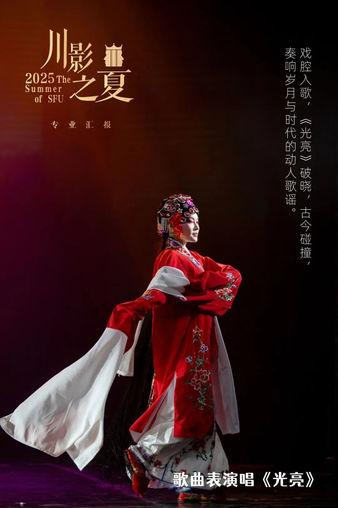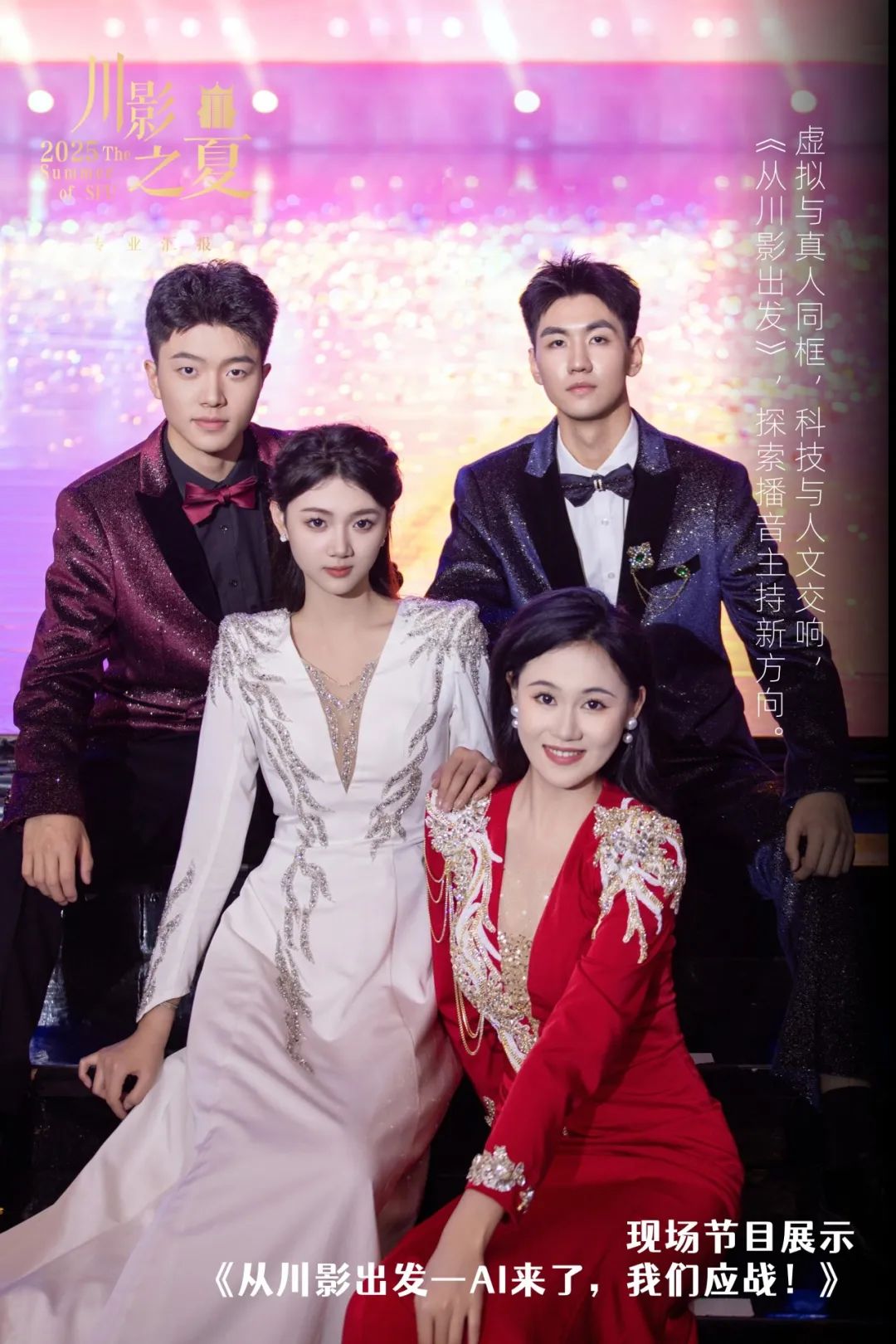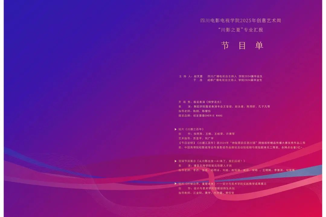 本次专业汇报演出特别邀请四川省教育厅、成都市文化广电旅游局、大邑县人民政府等相关政府部门领导、行业企业代表、媒体代表到场观看,并通过大象新闻APP、川影官方视频号、川影官方微博、川影招生办视频号同步直播。川影2024届校友,四川广播电视台主持人赵芃露、成都广播电视台主持人于浩搭档主持。