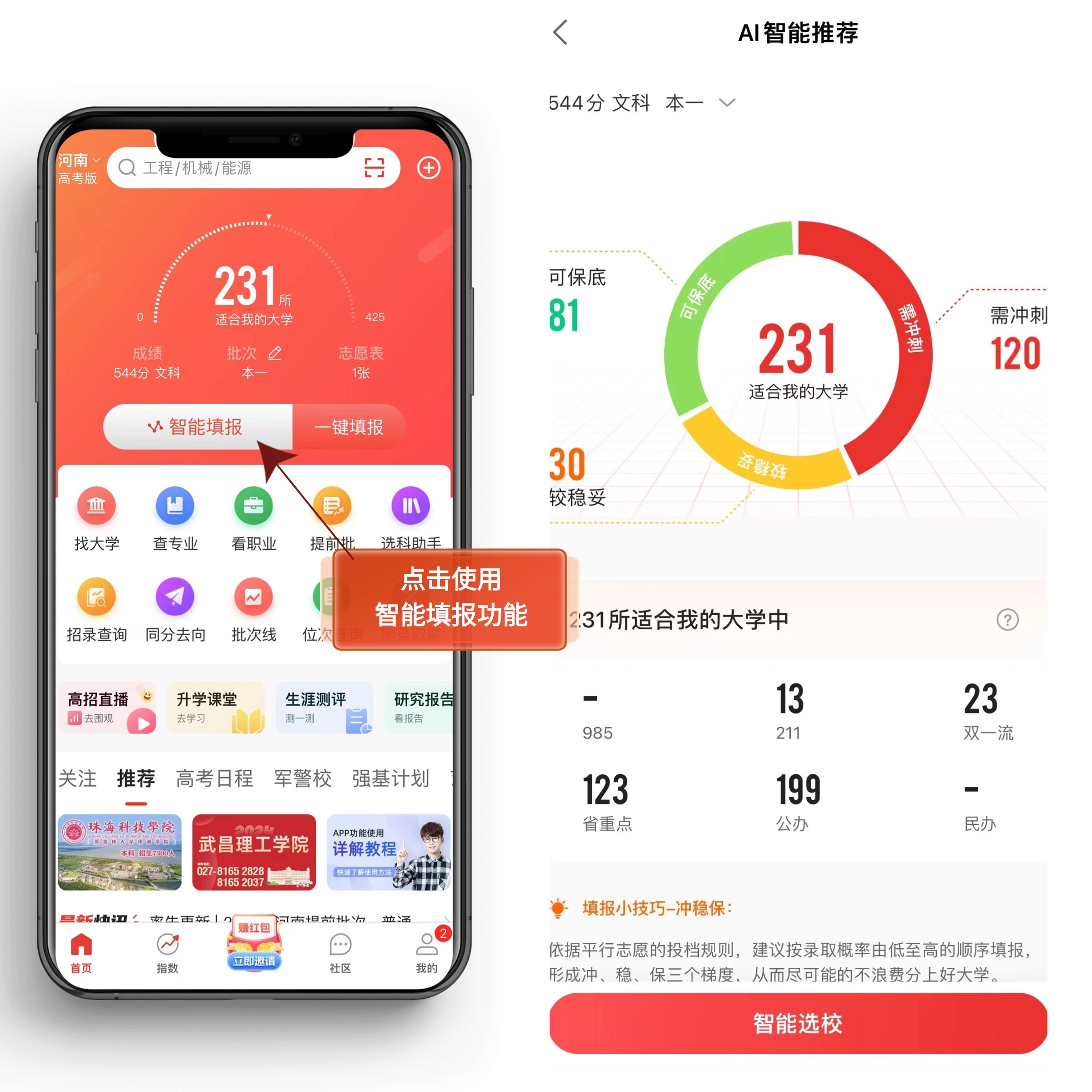 除了推荐院校还能形成冲、稳、保三个梯度,分别对应于略高于、接近、略低于考生成绩的院校,能够最大化利用每一分,既考虑到了考生对更好学校的追求,也确保了有较为稳妥的选择,降低了滑档的风险。