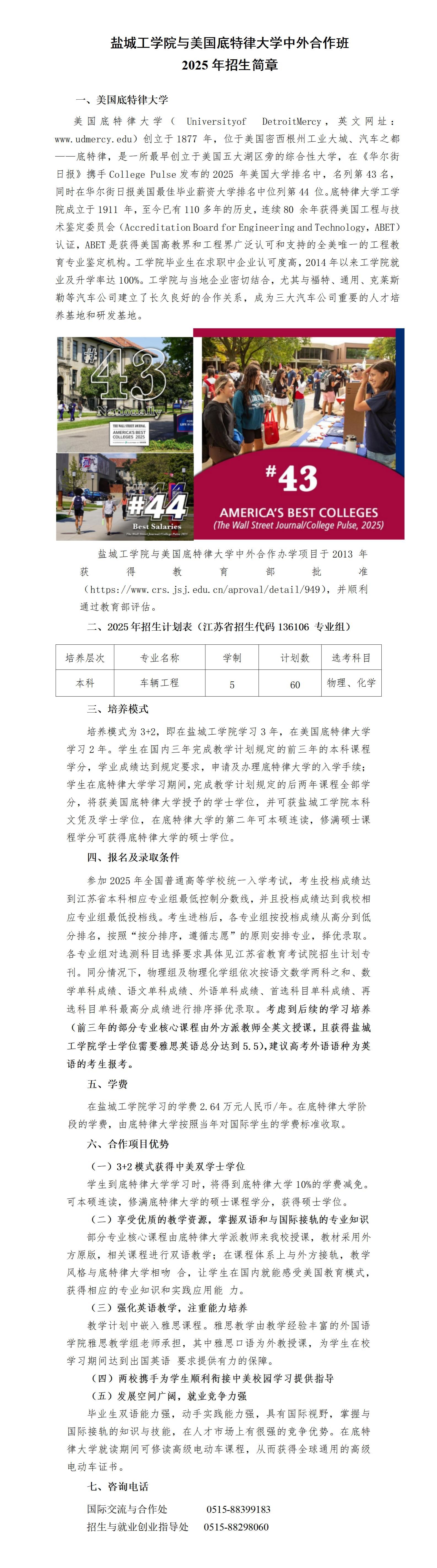 【2025年】盐城工学院与美国底特律大学中外合作班2025年招生简章