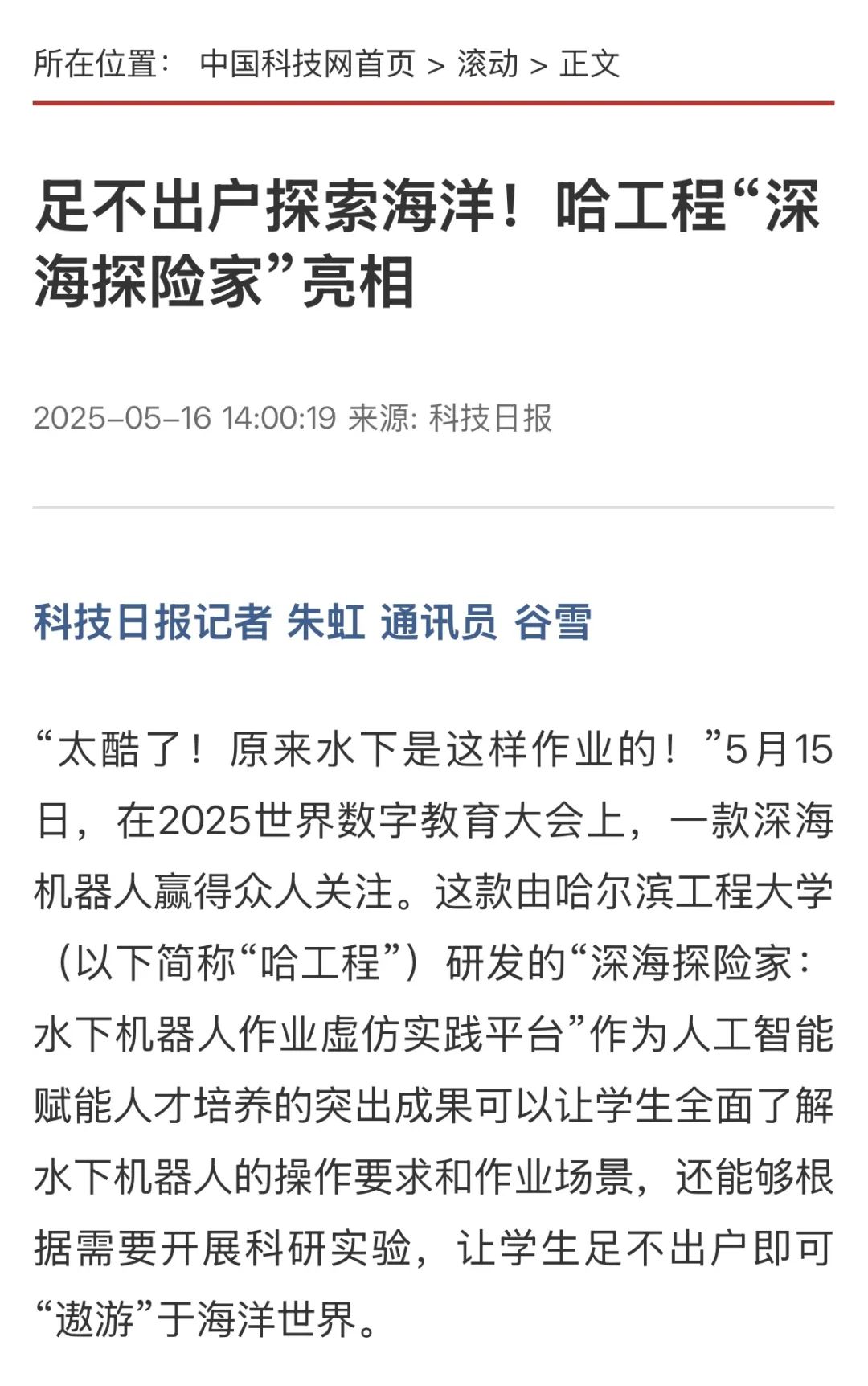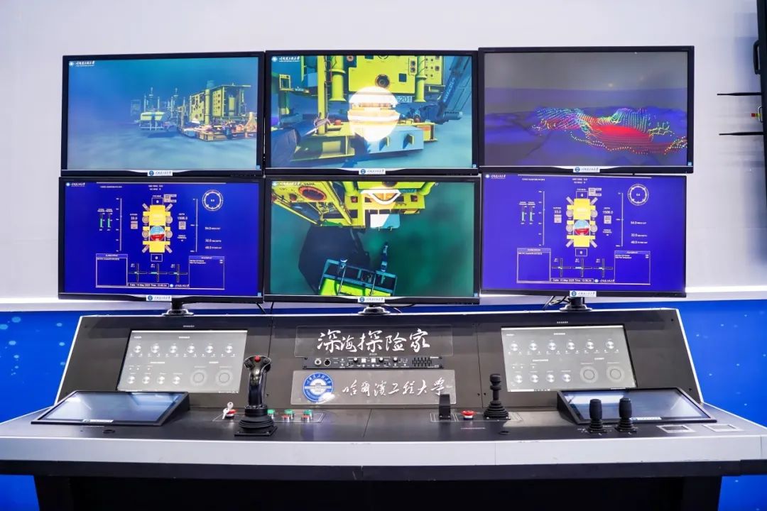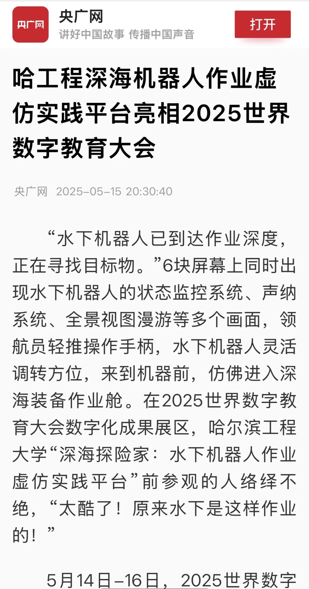 “水下机器人已到达作业深度,正在寻找目标物。”6块屏幕上同时出现水下机器人的状态监控系统、声纳系统、全景视图漫游等多个画面,领航员轻推操作手柄,水下机器人灵活调转方位,来到机器前,仿佛进入深海装备作业舱。在2025世界数字教育大会数字化成果展区,哈工程“深海探险家:水下机器人作业虚仿实践平台”吸引了众多教育界专家学者、行业领域的企业领导的关注,参展嘉宾就产学研用融合、教育教学数字化转型和智能化升级、智慧校园建设等与学校师生进行充分交流。参观的人络绎不绝、沉浸体验、驻足点赞。很多来参观的学生和家长表示:“太酷了!原来水下是这样作业的!对哈工程有了更深入地了解。”