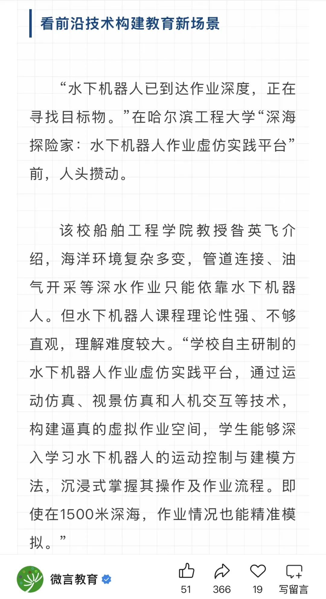 哈工程面向智能时代教育发展变革的挑战,立足“三海一核”学科优势,以数字技术推动教育教学改革创新,将重大工程案例转化为教学资源,构建产学研用深度融合的智慧教育新生态,培养可靠顶用、拔尖创新的新时代“工学”人才。