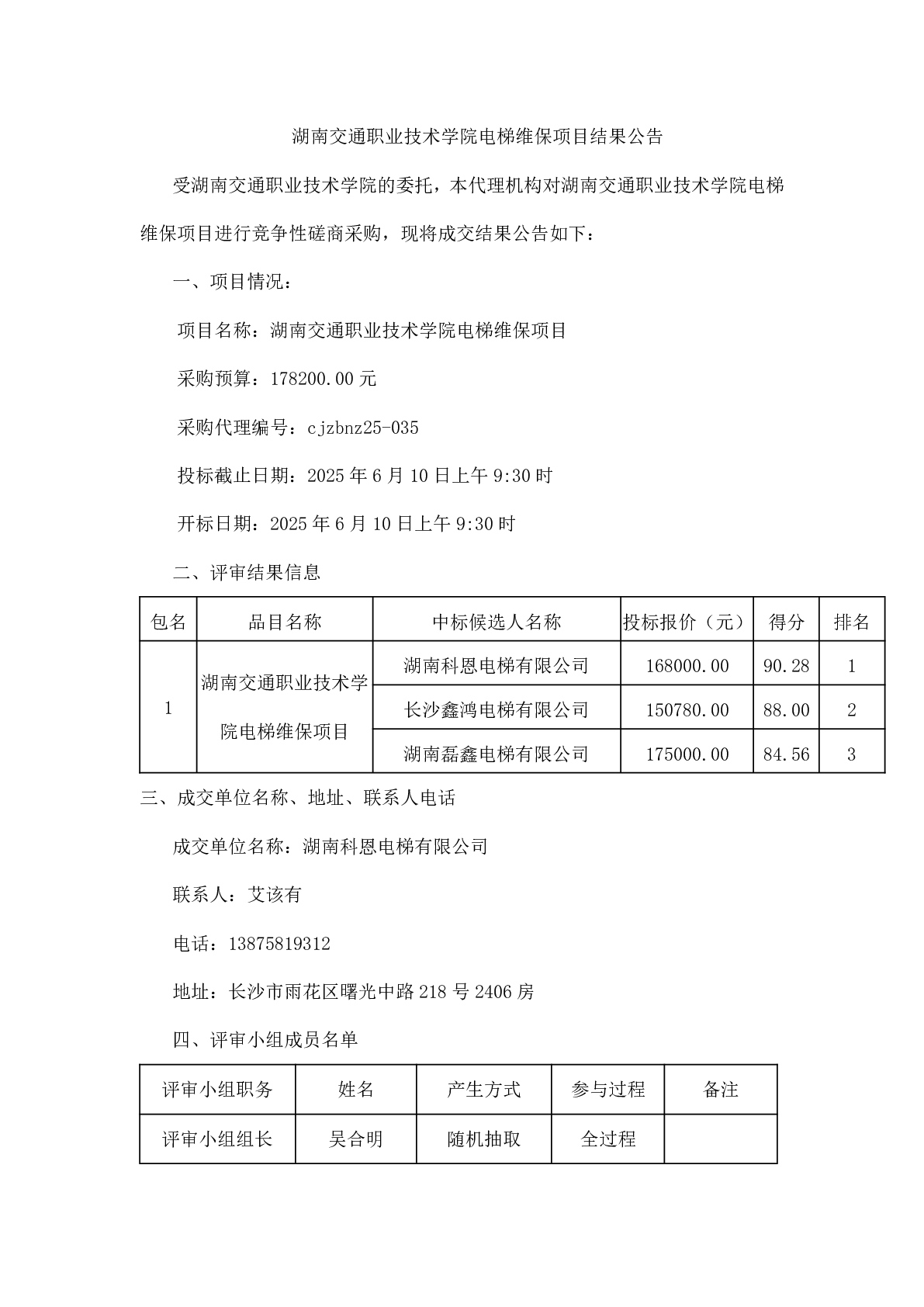 湖南交通职业技术学院电梯维保项目结果公告
