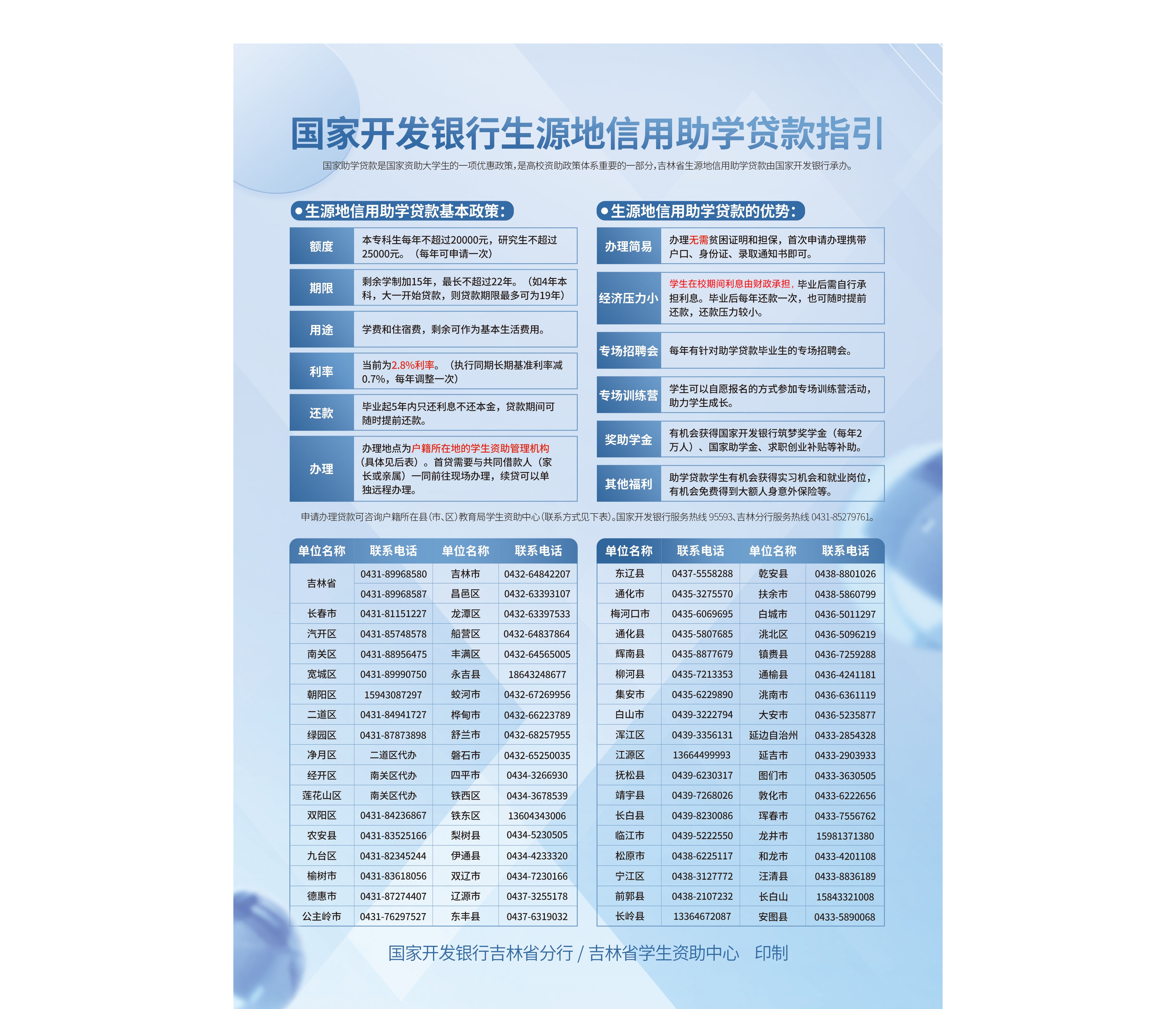吉林省生源地信用助学贷款由国家开发银行吉林省分行承办,由学生和家长(或其他监护人)作为共同借款人,共同承担还款责任,在学生户籍所在地县(市、区)学生资助管理机构办理。