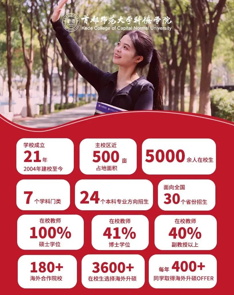 学校现设有人文与社会科学学院、智能科学与技术学院、艺术设计学院、传媒学院4个二级学院和国际教育学院、国际文化学院。2025年拟在24个本科专业及专业方向面向全国30余个省市招生,其中北京市级一流本科专业建设点4个。涵盖了教育学、文学、管理学、经济学、工学、理学、艺术学7个学科门类。学校实行学年学分制管理。学习期满成绩合格者,颁发首都师范大学科德学院本科毕业证书;符合学士学位授予条件者,颁发首都师范大学科德学院学士学位证书。更多学校内容点击下列链接
