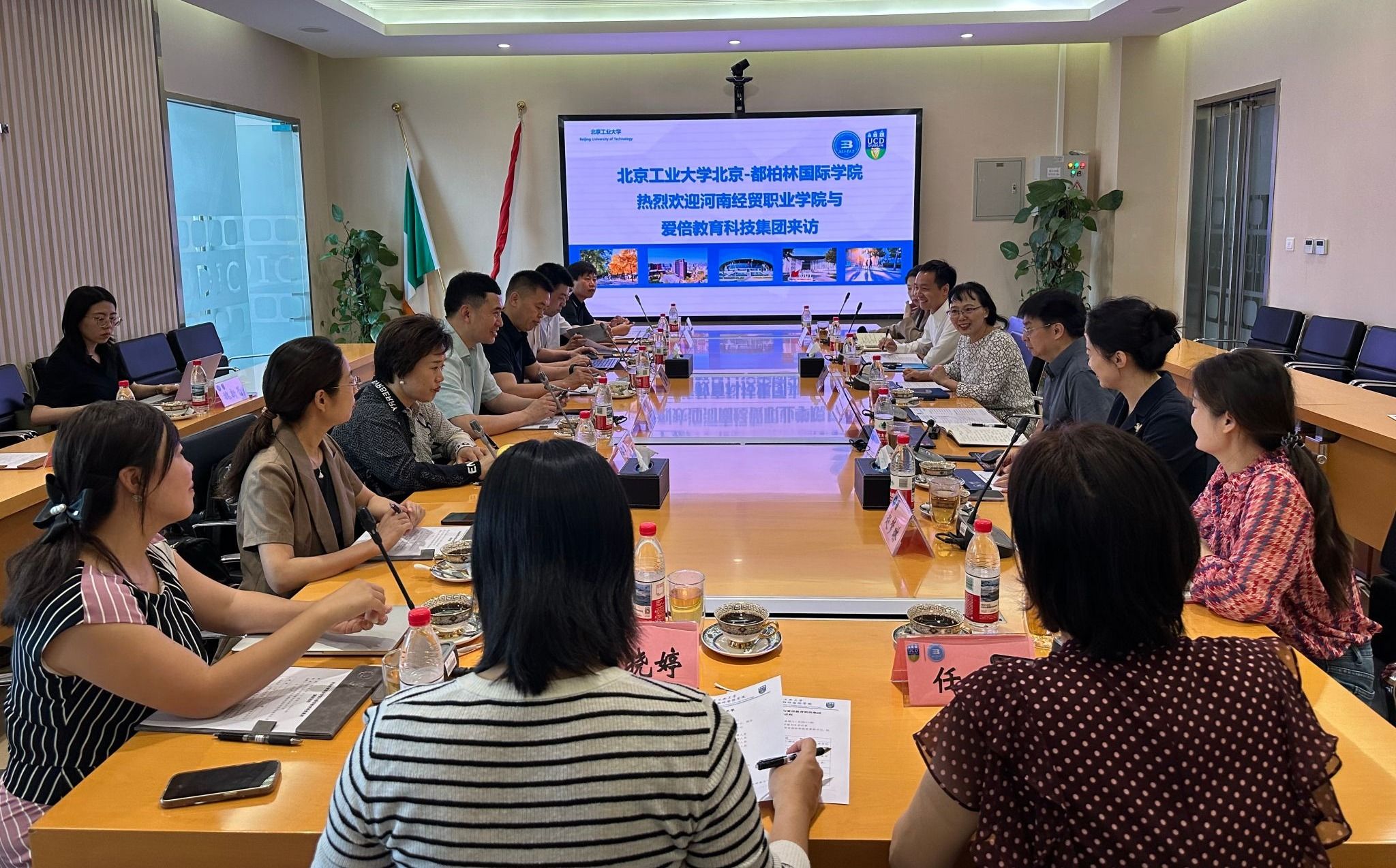 6月11日,河南经贸职业学院副校长康坤、爱倍教育科技集团董事长陈永华一行12人到都柏林学院调研交流。学院党委书记杨庆,党委副书记、院长吴文英,党委副书记张波,副院长张琳以及院务办公室人员参加会议。