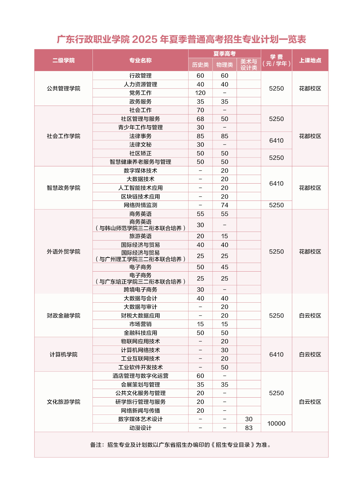 广东行政职业学院2025年夏季普通高考招生专业计划一览表