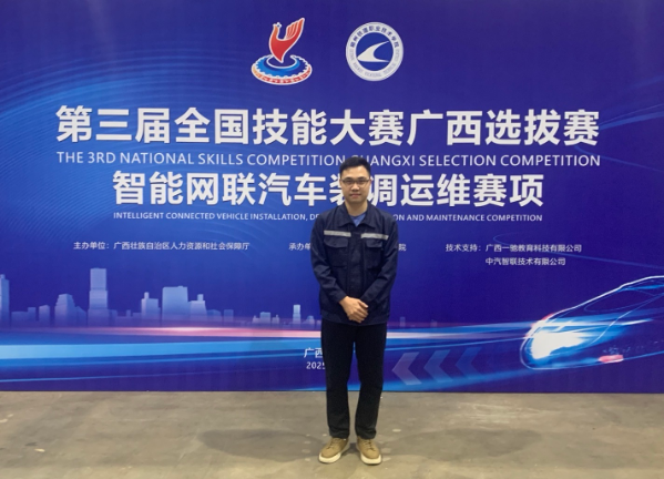 2025年4月9-10日,第三届全国技能大赛广西选拔赛智能网联汽车装调运维项目在柳州铁道职业技术学院顺利举行,我院汽车专业教师阮慧祥在来自全区企业与院校的共37名参赛选手中脱颖而出荣获第二名的优异成绩,充分展现了我校在智能网联汽车方向的技术水平与专业素养。