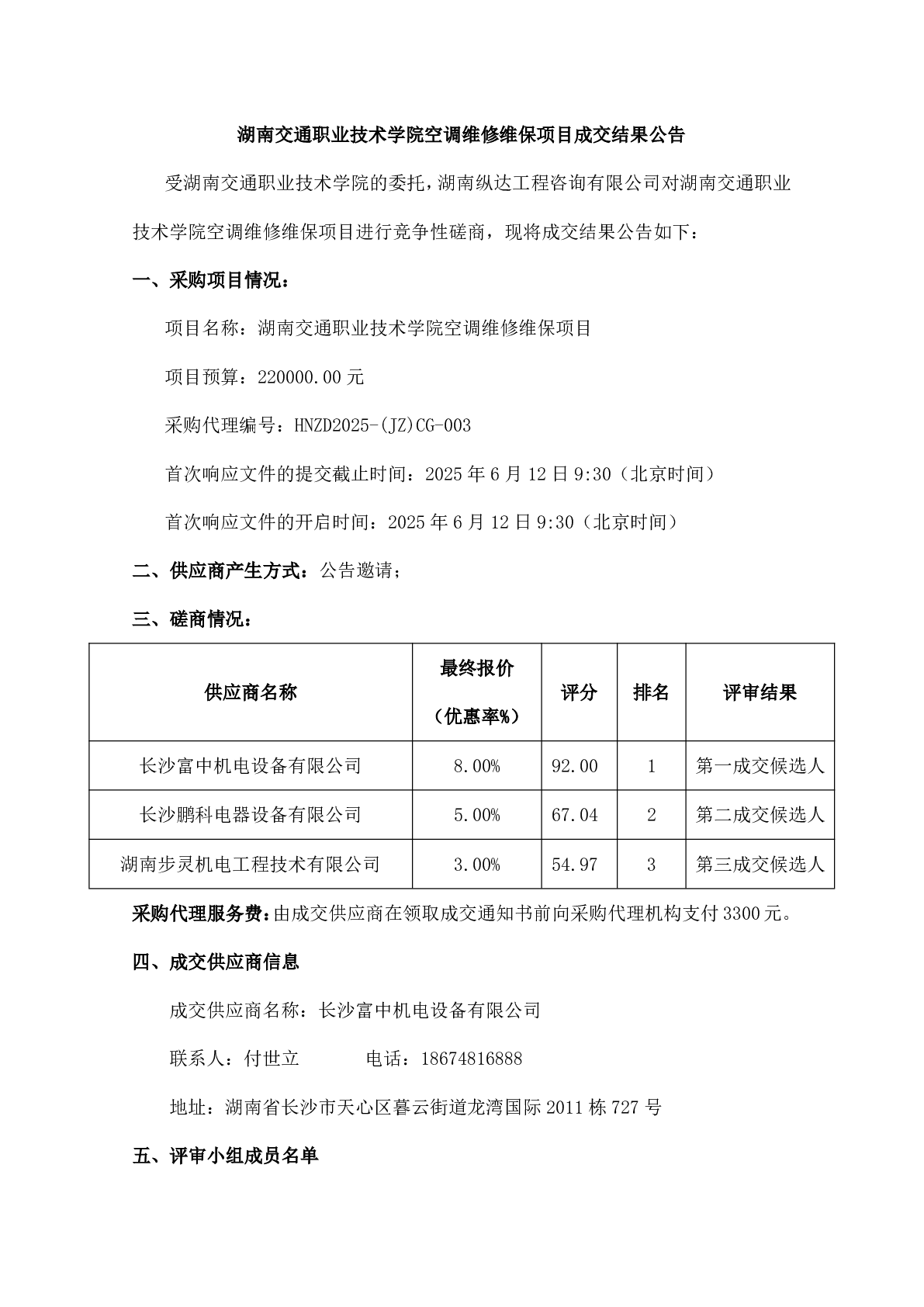 湖南交通职业技术学院空调维修维保项目成交结果公告