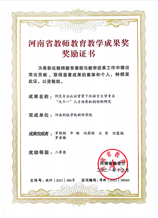 教学研究方面,逐步形成了以涉农法治和民俗文化鲜明特色的学科研究方向。主持国家社科基金项目10项,主持教育部人文社科项目、中国法学会研究课题、河南省社科规划项目等省部级项目30余项,获批省社科联人文社会科学重点研究基地1个,获批河南省本科高校名师工作室1个,获国家级一流本科课程7门、省课程思政样板课程2门、省高等教育教学成果二等奖1项、教师教育教学成果二等奖1项、公开发表学术论文200余篇。2023年荣获中共河南省委教育工作委员会“全省高校党建工作样板支部”、河南省社科联人文社会科学重点研究基地“乡村文化振兴与法治建设研究中心”、河南省高等学校高校名师工作室“罗艳娟中国语言文学名师工作室”。2023年成立了新乡工程学院首家“乡村振兴协同创新中心”,2024年成立了新乡工程学院首个人文社科类产业学院“民俗文化(豫北)数智化传播与保护产业学院”。