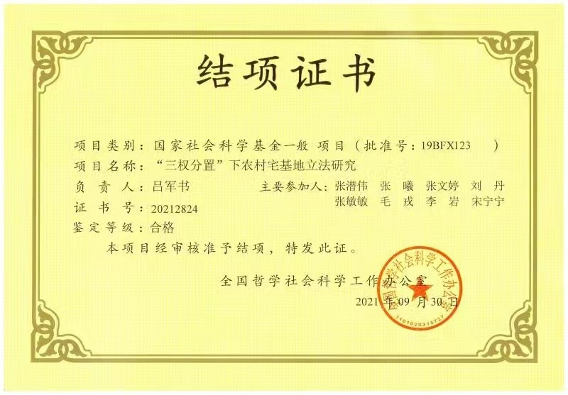 吕军书,二级教授,硕士生导师,新乡市首届“四个一批”人才。兼任河南师范大学三农法律问题研究中心研究员、副主任,中国法学会农业农村法治研究会理事,河南省法学会农业农村法治研究会副会长,新乡市法学会农业农村法治研究会会长,河南省法治智库专家。先后在《法学杂志》《政治与法律》《中国青年政治学院学报》《河南大学学报》等期刊发表学术论文106篇(其中CSSCI期刊、中文核心期刊共63篇);主持完成国家社科基金项目、教育部人文社科项目、中国法学会项目、河南省哲学社会科学项目、河南省政府决策招标课题等省部级以上课题项目14项;在法律出版社、新华出版社等出版学术专著4部,获得地厅级以上科研奖励20余项。