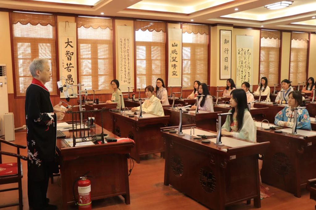 智慧书法实训室·毛笔字作为师范专业实践教学的主要场所,承担中华才艺、书法鉴赏、中国书画鉴赏及师范专业教学技能训练等核心课程教学任务。实训室智能化水平先进,配备教学直播系统、书法教学视频资源、自动笔洗系统等设施,是一个集书法教学、书法交流、书法查阅和书法作品展示等功能于一体的多功能现代化实训室。