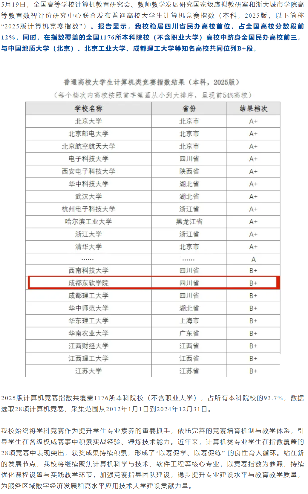 2025版计算机竞赛指数公布:我校位列民办高校全国前三、四川第一