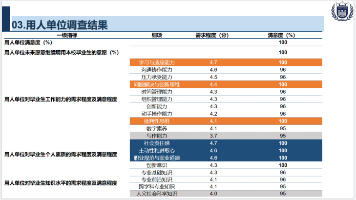 学校建立“需求-培养-反馈”闭环机制:邀请企业专家参与课程设计,将前沿技术和真实项目融入教学;通过雇主评价数据动态调整培养方案,优化核心课程设置。同时,学校注重批判性思维等核心能力培养,相关课程满意度达100%,成为用人单位认可的优势能力,精准匹配企业对“懂技术、善管理”人才的需求。