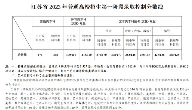 江苏省2023年普通高校招生第一阶段录取控制分数线