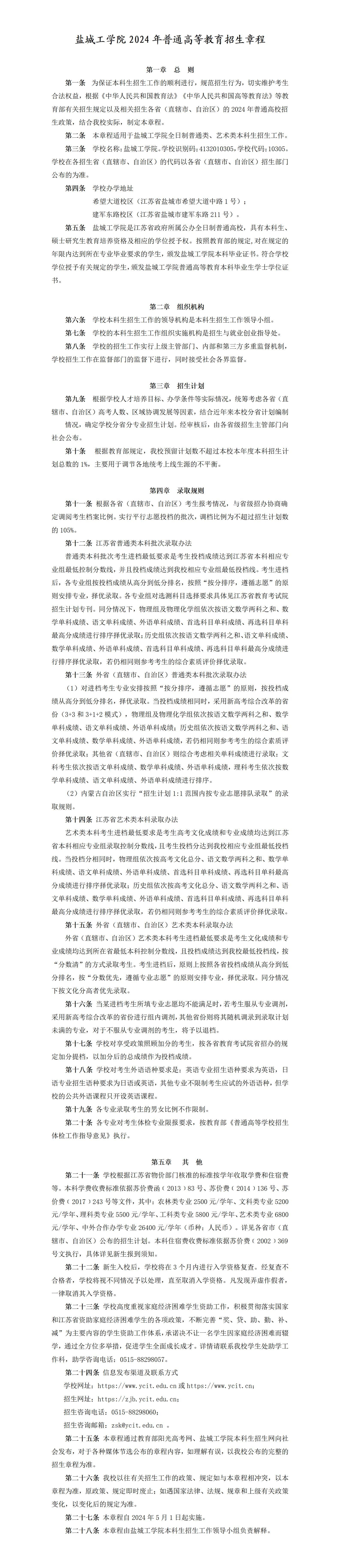 【2024年】盐城工学院招生章程