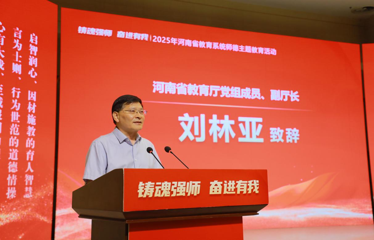 刘林亚指出,省委教育工委、省教育厅开展师德主题教育系列活动,旨在教育和引导广大教师忠诚党和人民的教育事业,坚定理想信念、陶冶道德情操、涵养扎实学识、勤修仁爱之心,树立“铸魂强师,奋进有我”的志向和抱负,坚守三尺讲台,潜心教书育人,着力培养堪当时代大任的社会主义建设者和接班人。他强调,站在新的历史起点上,要全面推进新时代教师队伍建设,以更高的要求、更大的力度、更实的举措,着力打造高素质专业化创新型教师队伍,大力弘扬尊师重教社会风尚,努力为广大教师立德修身、敬业立学、教书育人创造更好环境。希望各位教师坚守为党育人、为国育才的初心使命,弘扬立德树人、甘为人梯的高尚师德,大力弘扬和传承教育家精神,勇当先锋、争做示范、走在前列,为奋力谱写新时代新征程中原更加出彩的绚丽篇章作出新的更大贡献!