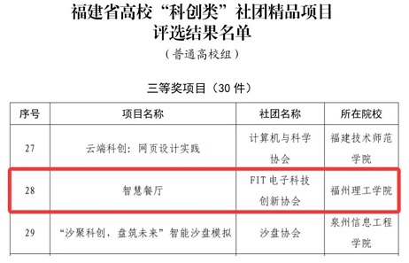 2025 年,共青团福建省委主办的福建省高校 “科创类” 社团精品项目评选活动在福州大学举行。经高校遴选申报和省级初选,厦门大学、福州大学、福建农林大学等 59 所省内高校的 132 个 “科创类” 社团项目脱颖而出,进入决赛。其中,福州理工学院电子工程学院指导的 “FIT 电子科技创新协会” 凭借《智慧餐厅》项目,荣获此次评选的 “科创类” 社团精品项目三等奖。