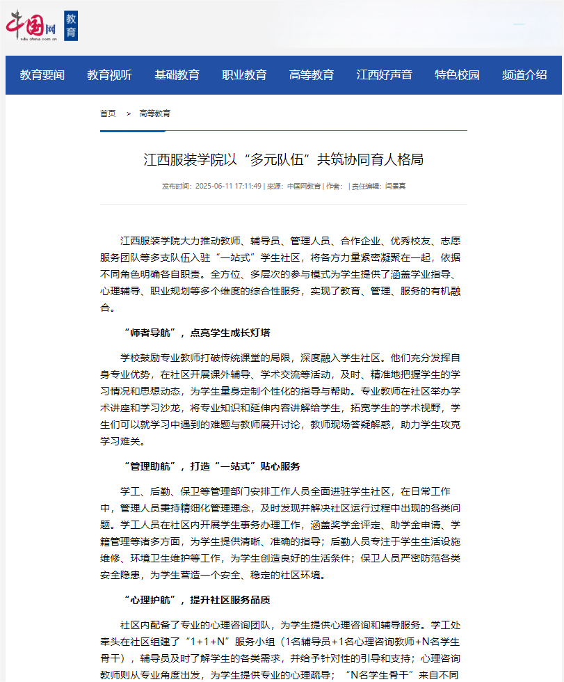 江西服装学院大力推动教师、辅导员、管理人员、合作企业、优秀校友、志愿服务团队等多支队伍入驻“一站式”学生社区,将各方力量紧密凝聚在一起,依据不同角色明确各自职责。全方位、多层次的参与模式为学生提供了涵盖学业指导、心理辅导、职业规划等多个维度的综合性服务,实现了教育、管理、服务的有机融合。