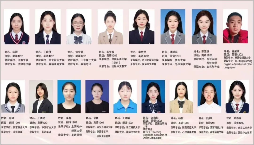 近五年,毕业生年均就业率始终保持在96% 以上,平均考研率在15%以上。其中,70余名同学被上海外国语大学、北京外国语大学、南京大学、武汉大学、北京师范大学、南京师范大学等国内知名高校录取。10余名同学被英国爱丁堡大学、谢菲尔德大学、日本新泄大学、墨尔本大学等国外著名高校录取。