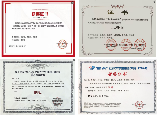 学院强化创新创业项目培育指导工作。近年来,在“互联网+”“挑战杯”等大学生创新创业比赛中,我院学生主持的多个项目进入校赛决赛并被推荐参加省赛、市赛。“乡村振兴谋发展,产业转型致富路”获第十七届“挑战杯”大学生课外学术作品竞赛红色专项江苏省三等奖;“豆废不弃”等项目获第七届“互联网+”江苏省赛一、二、三等奖,获得第八届中国国际“互联网+”大赛全国二等奖;“你说的都队”荣获2024年商业精英挑战赛会计与商业管理案例竞赛国赛二等奖;“雨中真相-雨天模糊图像高清处理先行者”荣获第十四届“挑战杯”大学生创业计划竞赛江苏省选拔赛铜奖、第十四届“挑战杯”中国大学生创业计划竞赛“秦创原”创新挑战赛铜奖;学院鼓励有兴趣、有能力的学生提前参与老师的科研项目,引导学生把专利申请与专业学习相结合,为学生开展专利研究提供必要的设备、技术支持。近年来,学生以第一作者共申请发明专利近20项。同时,学院组织学生积极申报大学生创新训练计划项目,近年来共立项大创项目80余项,其中省级以上20余项。