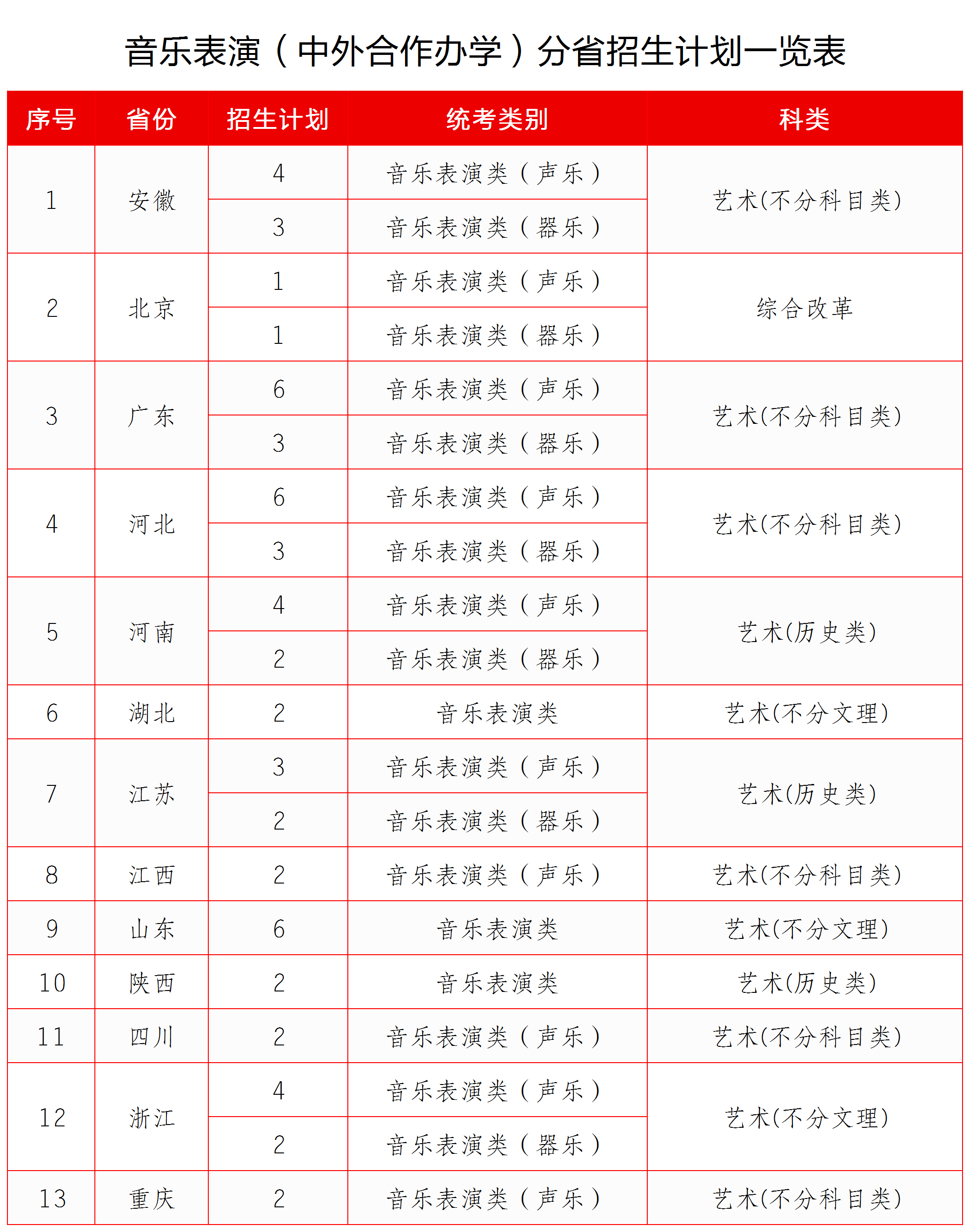 三、招生专业及计划 招生专业为音乐表演(中外合作办学),专业代码130201H。招生计划60人。