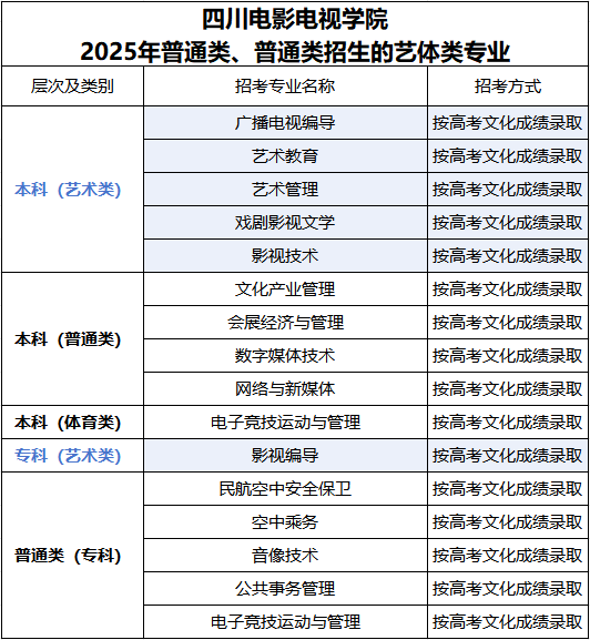 四川电影电视学院共有共16个按照高考文化成绩录取专业,包含10个本科和6个专科专业,涵盖艺术类、普通类和体育类三大类别。学校立足自身特色,注重学科交叉与专业融合,精心打造多元化育人模式,致力于培养兼具文化素养与专业能力的高质量复合型人才。