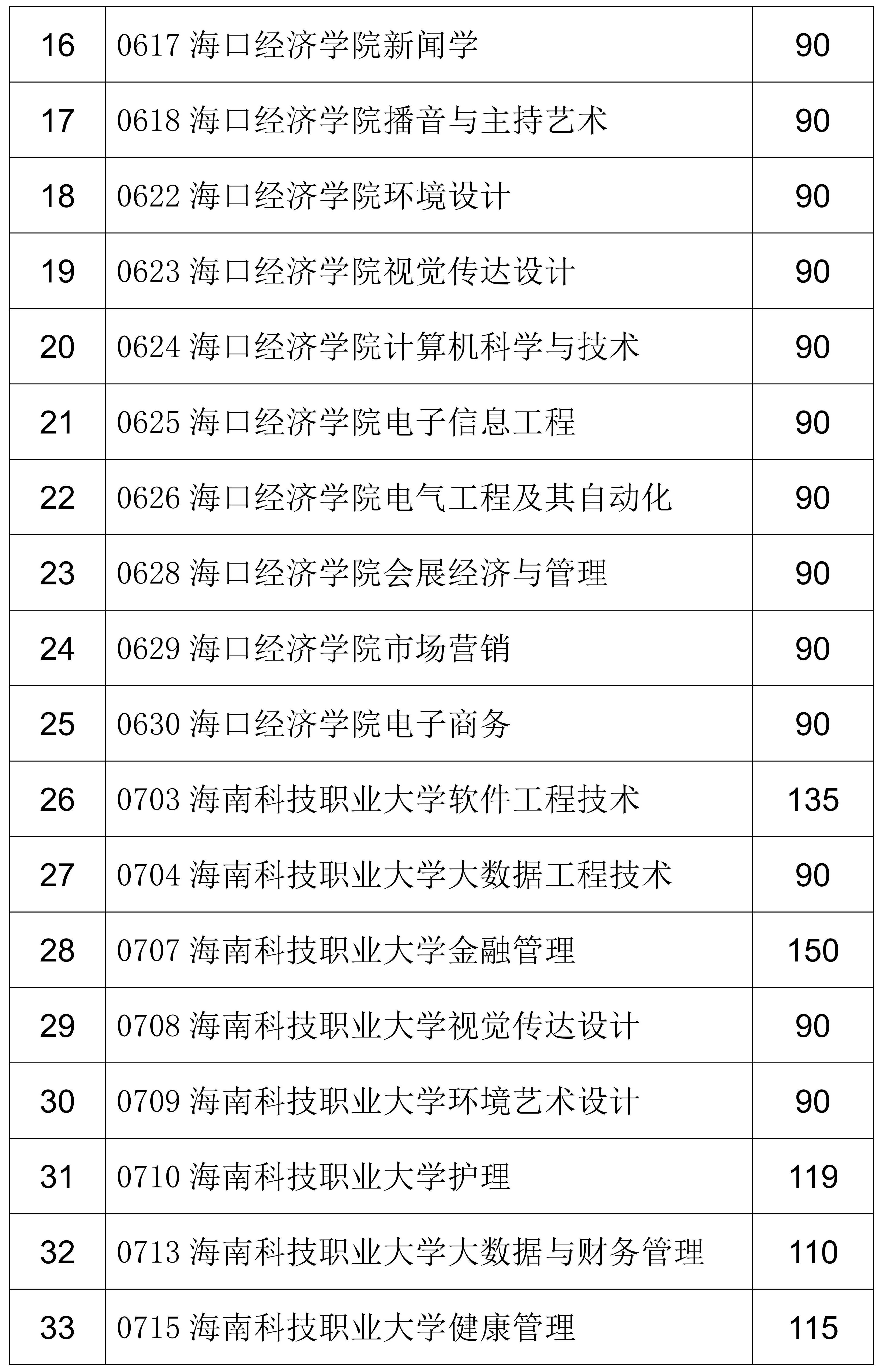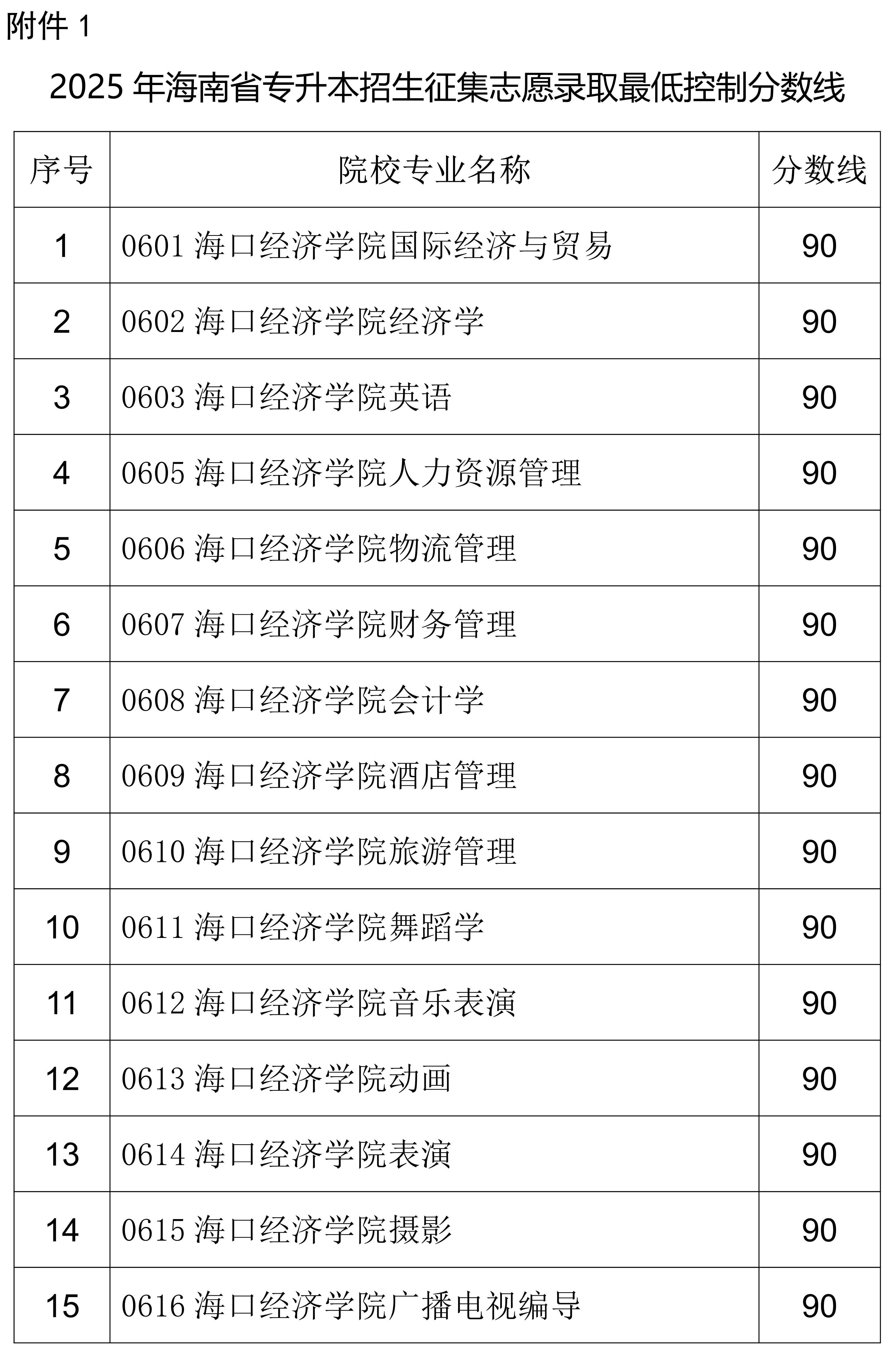 2025年海南省普通高等学校专升本招生征集志愿录取最低控制分数线为不低于90分,按照招生学校各专业征集志愿招生计划数1:1比例划定(详见附件1)。考生成绩不低于划定报考学校相应专业的最低录取控制分数线,则确认为所报考学校相应专业预录取的考生,考生也可向报考学校查询本人的预录取信息。