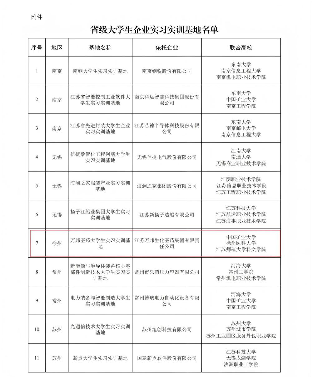近日,江苏省教育厅、江苏省工业和信息化厅公布了省级大学生企业实习实训基地名单。学院联合中国矿业大学、徐州医科大学与江苏万邦生化医药集团有限责任公司成功获批“万邦医药大学生实习实训基地”。据悉,此次共评定20个省级大学生企业实习实训基地,学院是省内独立院校中唯一一所荣获此殊荣的高校。