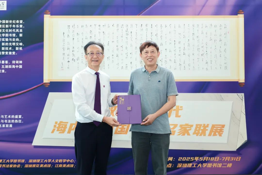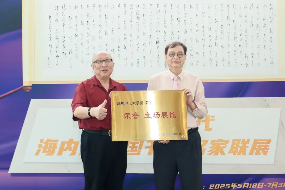 海外暨港澳台中国书法家协会主席吴任为深圳理工大学图书馆颁发“荣誉主场展馆”牌匾,深圳理工大学教务长赵伟代表学校接受牌匾。