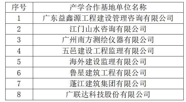 我校建筑设计专业确立技能人才培养的教育观,突出“能力”训练,强化技能培训和职业技能的拓展训练,先后与广东益鑫源工程建设管理咨询有限公司、江门山水咨询有限公司、广州南方测绘仪器有限公司、江门蓬江建筑集团有限公司、广联达科技股份有限公司等著名企业建立校企合作实训基地,学校与企业共同开发课程,共同培养学生。校企合作共同加强和完善建筑设计实训基地建设能够为学生提供一个真实的社会工作环境,学生可以掌握企业各个建筑设计工作岗位的技能,不断完善和拓展自己的建筑设计理论知识体系和提高建筑设计方面的实际操作能力。见下表