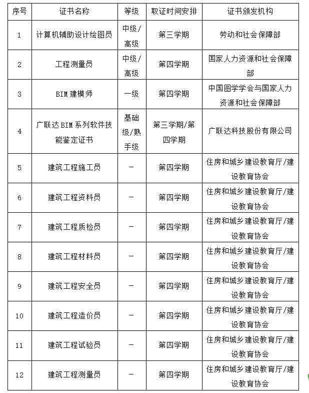 注重课证融通,强化学生BIM建模、施工员、测量员、及建造师等方面知识的学习,使得学生获得住房和城乡建设部门颁发的工程建设现场管理岗位施工员、测量员、BIM建模员等证书,为学生以后参加相应职业资格考试打下坚实的专业基础。