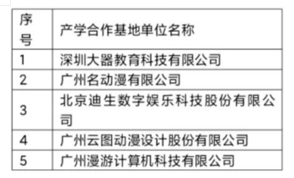 我校动漫制作技术专业积极探索实践订单培养、顶岗实习等工学结合,以培养学生的综合职业能力为目标,在真实的职场环境中使学生得到有效的训练,实现校企双方的互利双赢。先后与深圳大器教育科技有限公司、广州名动漫有限公司、北京迪生数字娱乐科技股份有限公司、广州云图动漫设计股份有限公司、广州漫游计算机科技有限公司等,进行岗位实训课程,共同培养学生。校企合作共同加强和完善动漫制作技术基地建设能够为学生提供一个真实的社会工作环境,学生可以掌握动漫相关岗位技能,不断完善和拓展自己的动漫理论知识体系和提高动漫制作的实际操作能力。见下表。
