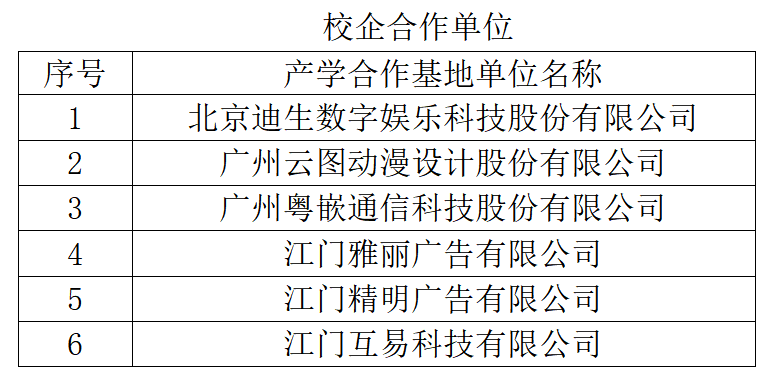 我校数字媒体技术专业确立技能人才培养的教育观,突出“能力”训练,强化技能培训和职业技能的拓展训练,先后与北京迪生数字娱乐科技股份有限公司、广州云图动漫设计股份有限公司、广州粤嵌通信科技股份有限公司、江门雅丽广告有限公司、江门精明广告有限公司、江门互易科技有限公司等企业建立校企合作实训基地,学校与企业共同开发课程,共同培养学生。见下表。