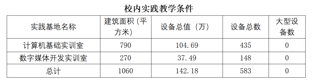 目前本专业校内实训基地总建筑面积1060平方米;设备总值142万元;总设备数583。校内实践教学条件如表及图片所示。