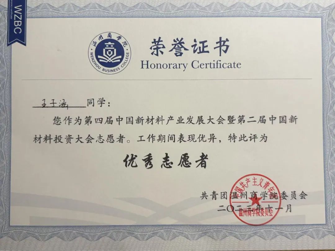 在课外,王子涵用行动诠释青年担当。不论是曾在疫情期间加入了医疗志愿者,还是作为艺术团成员参与迎新宣传活动,在第四届中国新材料发展大会中也能看到她忙碌奔走的身影,100+小时的志愿服务时长,不仅是她奉献精神的见证,更是她青春岁月里最温暖的注脚。