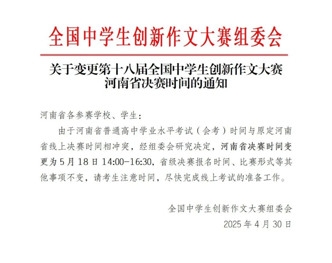 注:河南省级决赛相关注意事项请参看《关于举办第十八届全国中学生创新作文大赛5月18日线上省级决赛的通知》