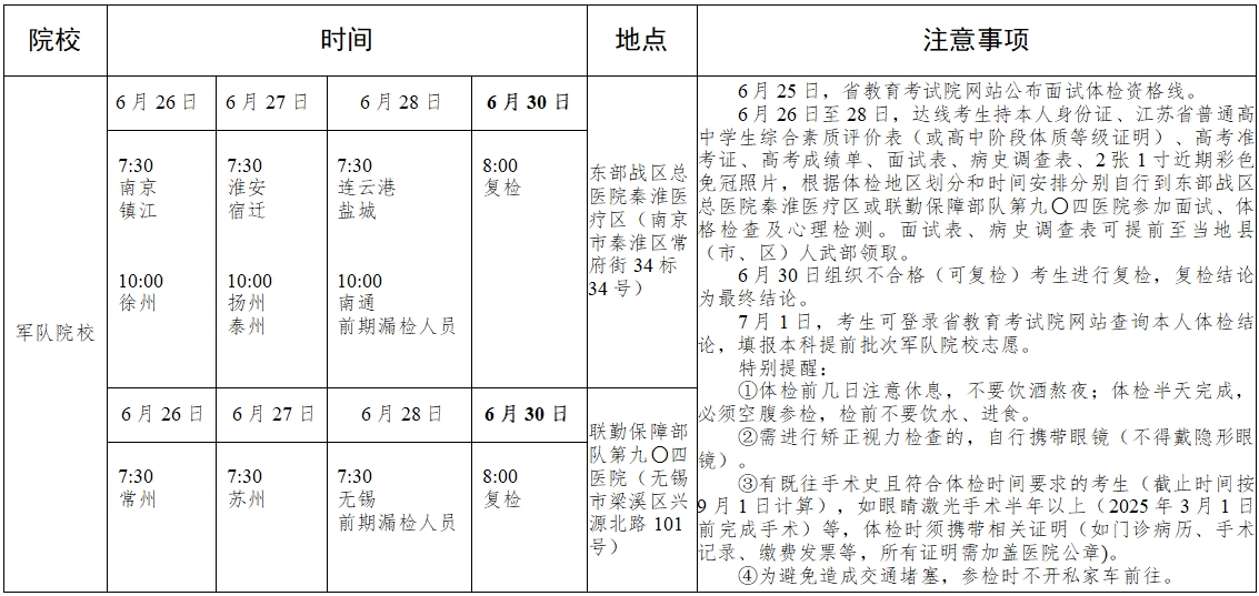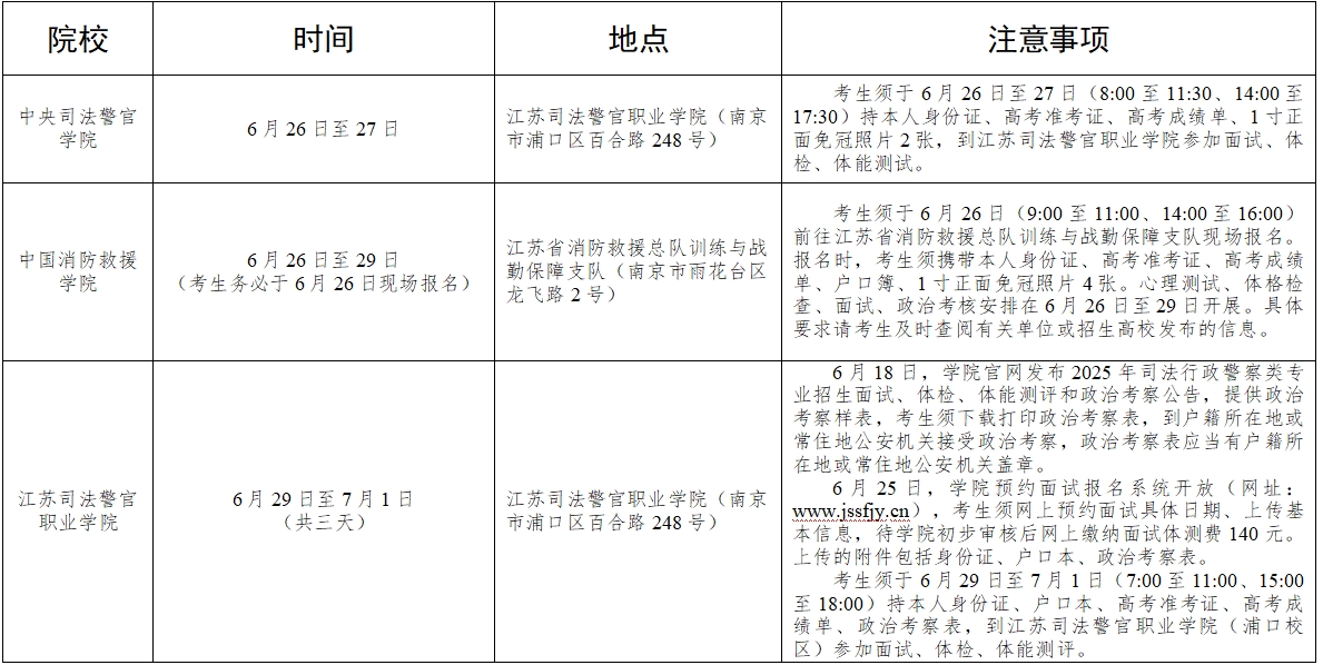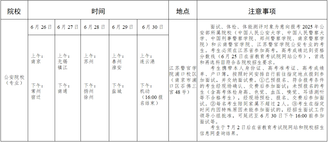 江苏省2025年部分院校面试、体检、体能测评、心理检测等安排表