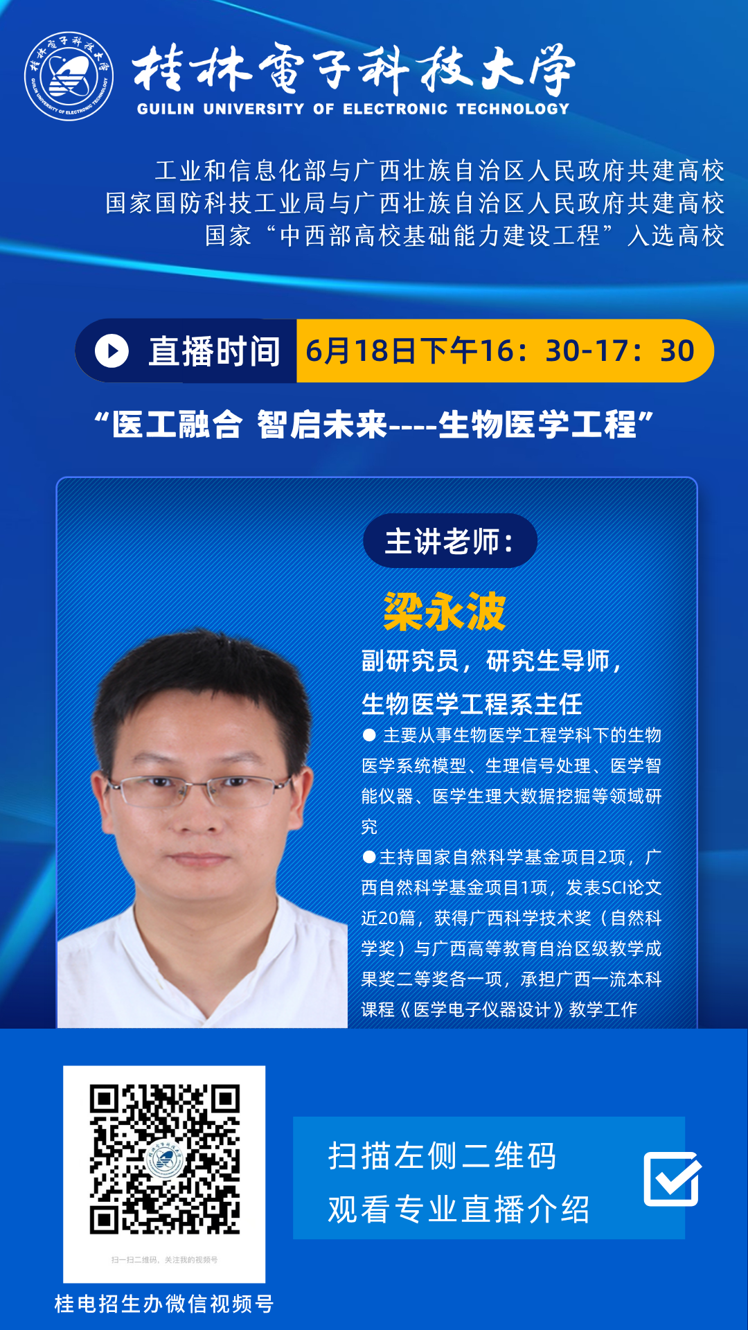 梁永波,副研究员,研究生导师,生物医学工程系系主任。主要从事生物医学工程学科下的生物医学系统模型、生理信号处理、医学智能仪器、医学生理大数据挖掘等领域研究,特别是在心血管疾病预防、高血压筛查、可穿戴血压测量等方面开展深入研究。目前主持国家自然科学基金项目2项,广西自然科学基金项目1项,以第一作者或通讯作者发表SCI论文近20篇,获得广西科学技术奖(自然科学奖)与广西高等教育自治区级教学成果奖二等奖各一项,承担广西一流本科课程《医学电子仪器设计》教学工作。