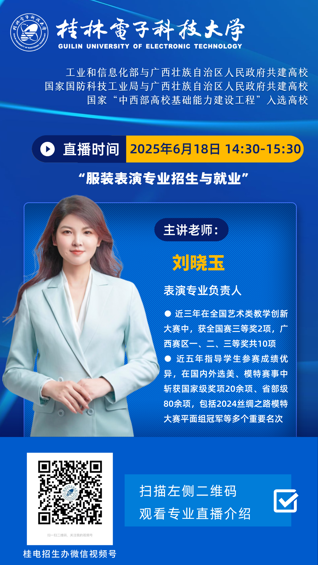 刘晓玉,女,河北承德人,桂林电子科技大学艺术与设计学院表演专业负责人。近三年参加全国艺术类教学创新大赛荣获全国赛三等奖2项,广西赛区一等奖2项、二等奖4项、三等奖4项;指导学生参赛获得2024丝绸之路模特大赛平面组冠军、国际旅游小姐季军,中国大学生服装模特大赛二等奖和三等奖,2024世界先生中国赛区决赛最佳气质奖等,近五年指导学生参加国内选美和模特大赛获得国家级表演奖项20余项,省部级80余项。
