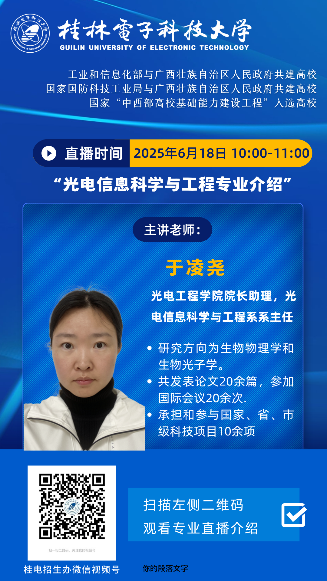 于凌尧,女,博士,光电工程学院院长助理,光电信息科学与工程系系主任。博士毕业于加拿大拉瓦尔大学。其研究方向为生物物理学和生物光子学。共发表论文20余篇,参加国际会议20余次,承担和参与国家、省、市级科技项目10余项。
