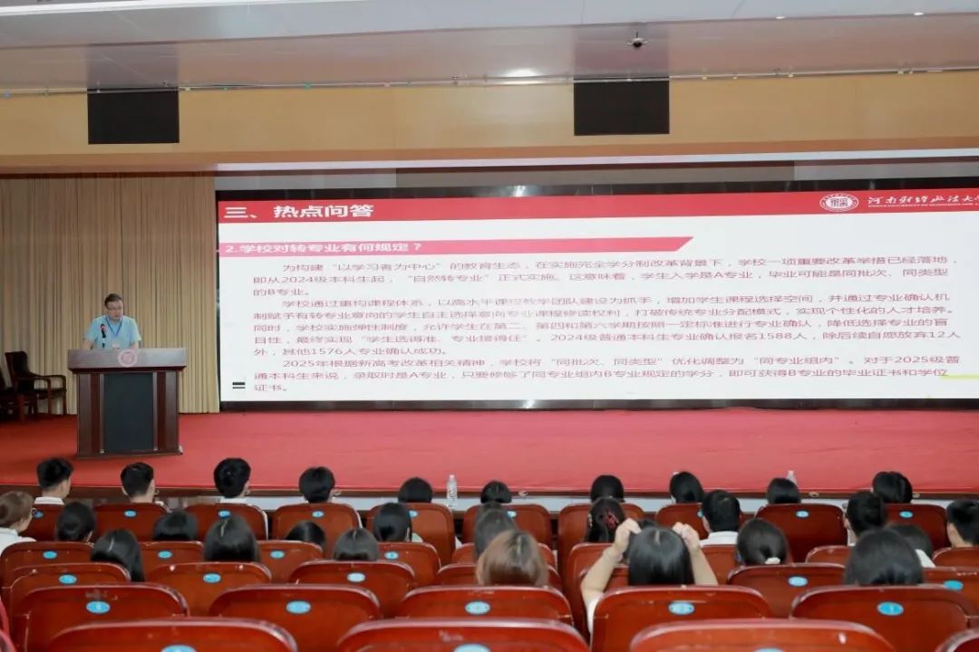 活动尾声,招生办公室负责人以详实的数据、清晰的图表,精准解读我校 2025 年招生政策,从专业设置、录取规则、自然转专业到书院文化,助力学子们锚定未来方向。人文艺术学部负责人通过生动的案例、精彩的专业成果展示,将学部的办学特色、学科优势娓娓道来,勾勒出一幅幅充满可能的求学画卷,点燃了在场学子对未来的无限憧憬与思考。