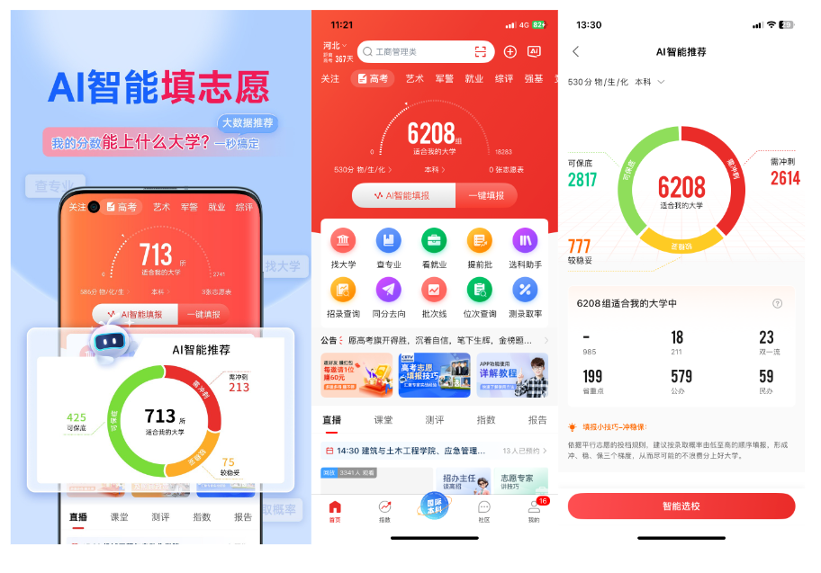 优志愿的高考指数功能采用多维度可视化分析技术,分析报考变化趋势,大数据云计算会根据历年数据与当年招生计划横向对比,预测录取概率。其智能填报功能结合AI技术和独创算法,从院校优先、专业优先、职业优先三种模式匹配符合考生需求的院校与专业,定制“冲稳保”志愿填报方案。