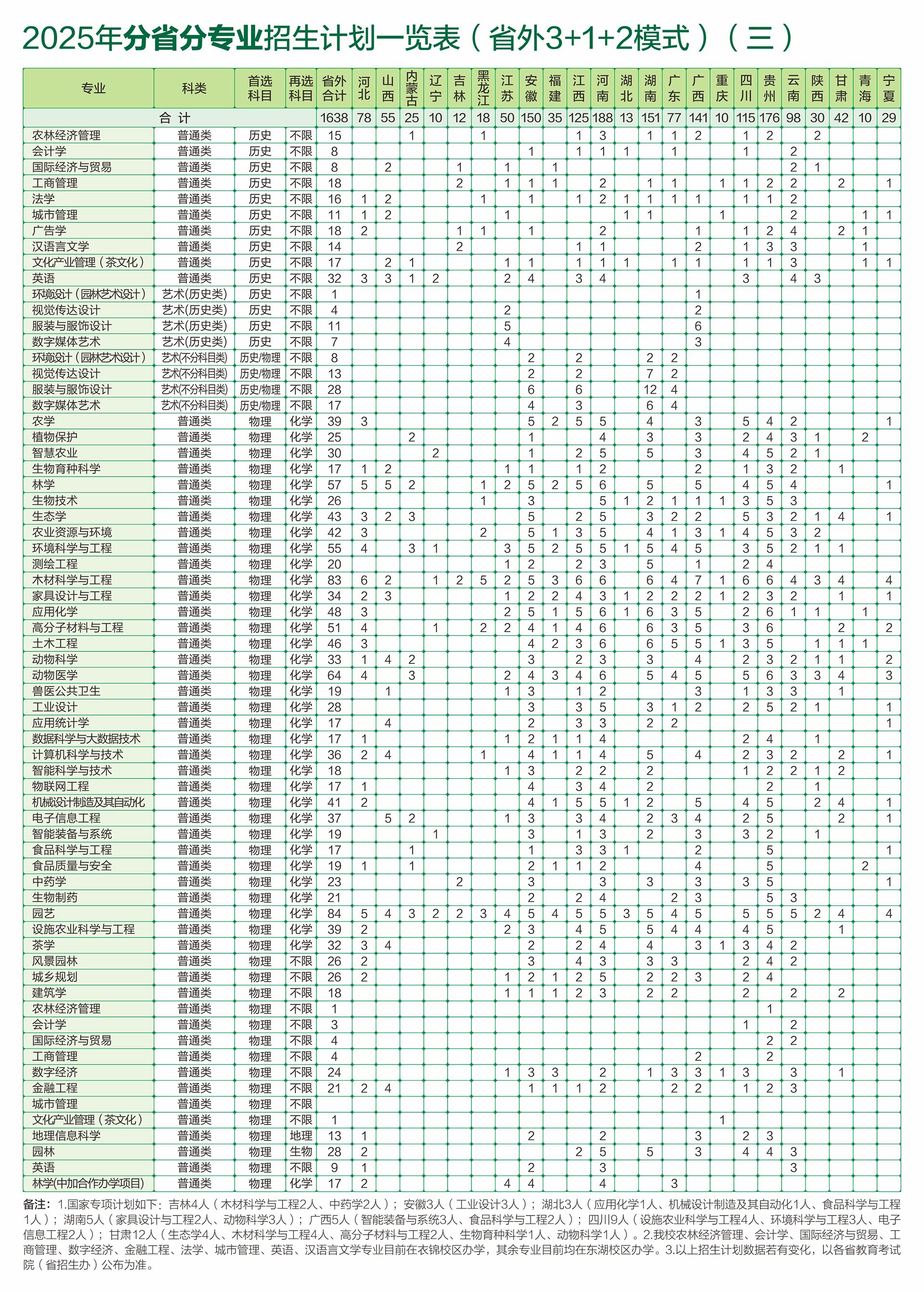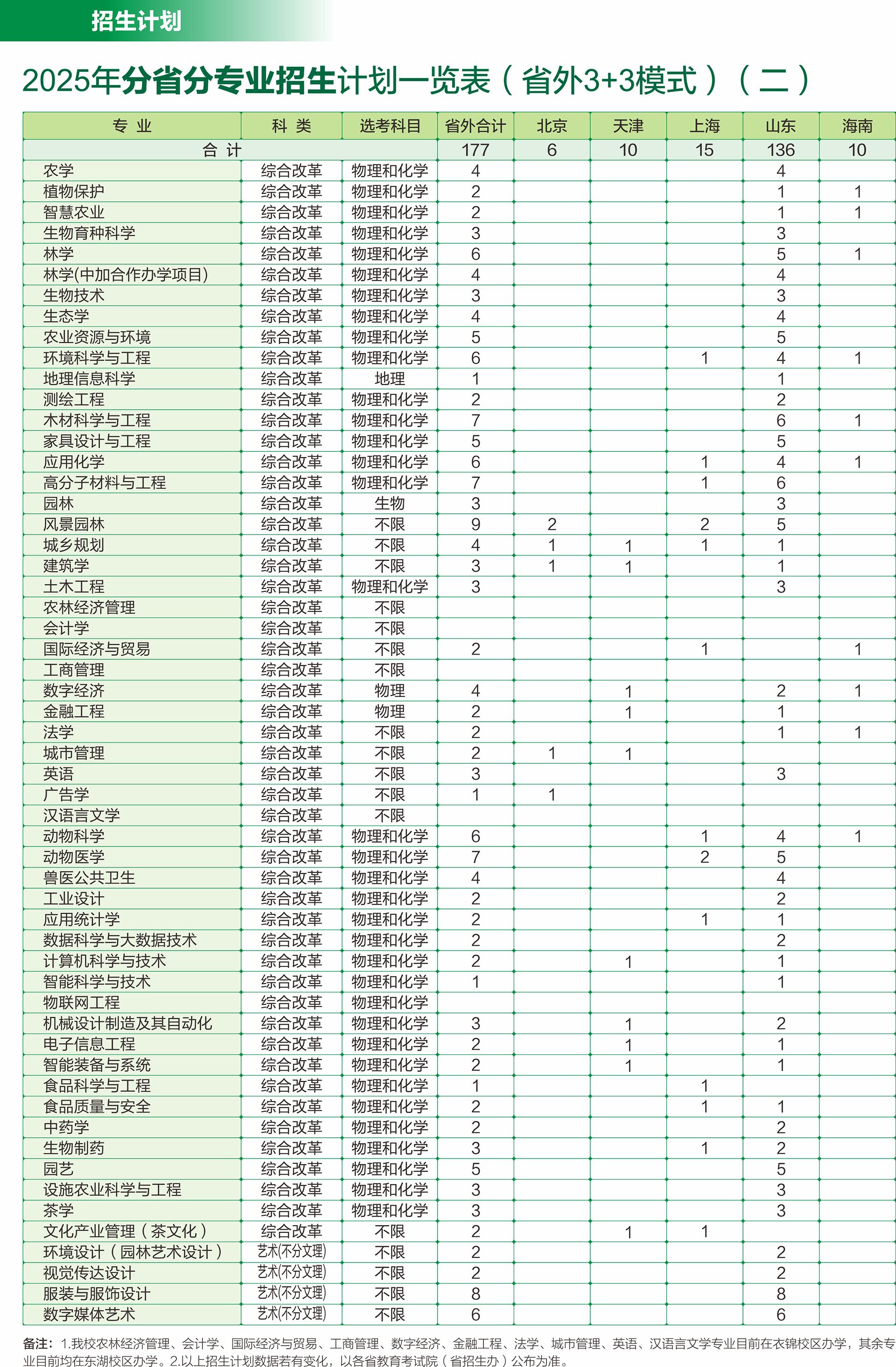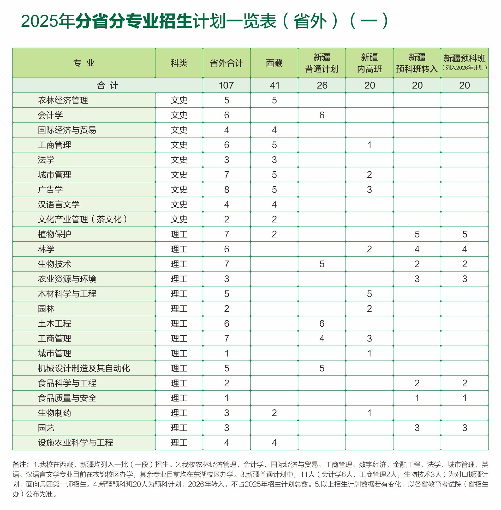 浙江农林大学2025年(省外)分省分专业招生计划一览表