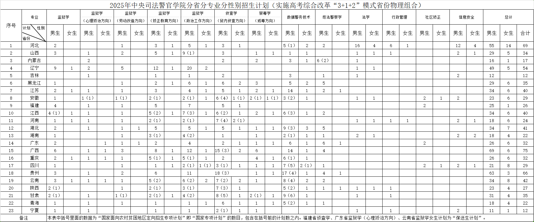 2025年中央司法警官学院分省分专业分性别招生计划(实施高考综合改革“3+1+2”模式省份物理组合)
