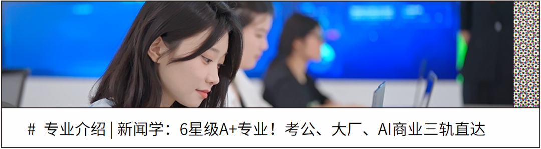 如果你热爱传媒行业,渴望掌握AI、大数据等前沿技术,文化传媒学院将为你打开真实产业场景的大门——从课堂到名企的无缝衔接、传统媒体与互联网大厂的多元选择、创业与考公的灵活路径、双语培养与国际研学的广阔平台。加入我们,以传媒之力,定义未来!