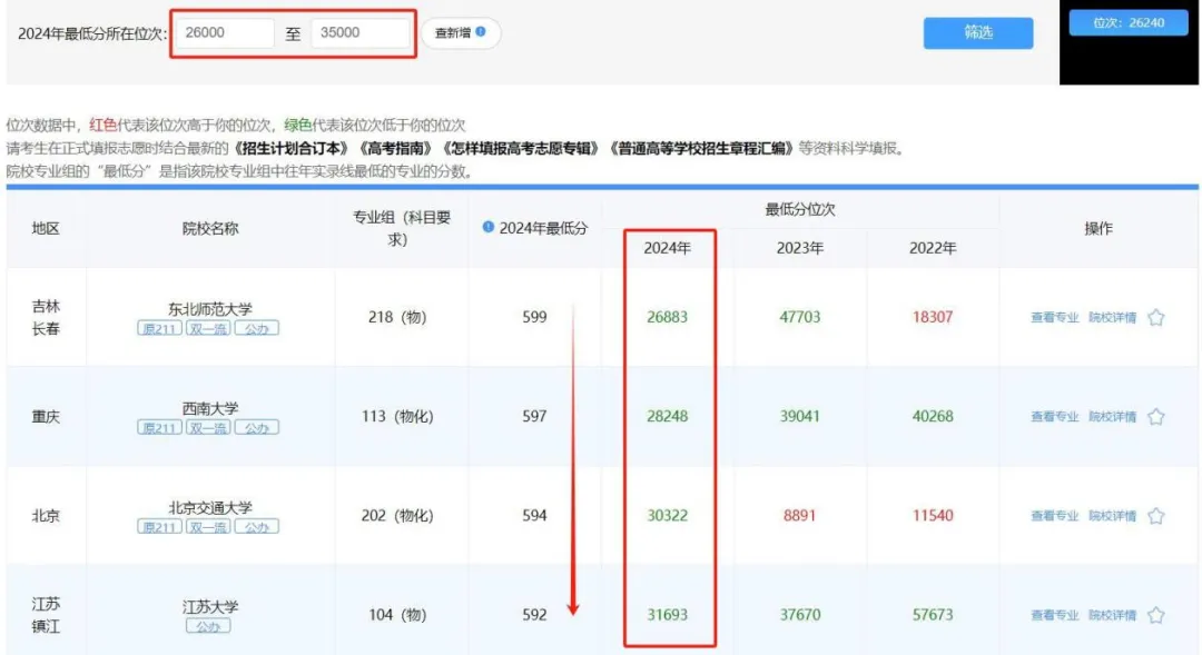 值得注意的是,院校专业组平行志愿填报依据“位次优先、遵循志愿、一轮投档”的原则进行投档,虽然45个平行志愿没有主次之分,但在检索中是按自然顺序进行的。