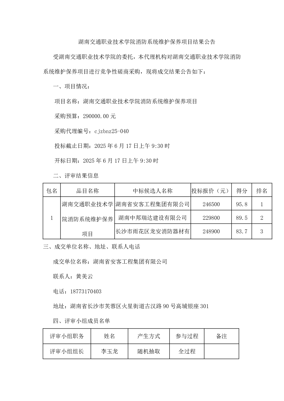 湖南交通职业技术学院消防系统维护保养项目结果公告