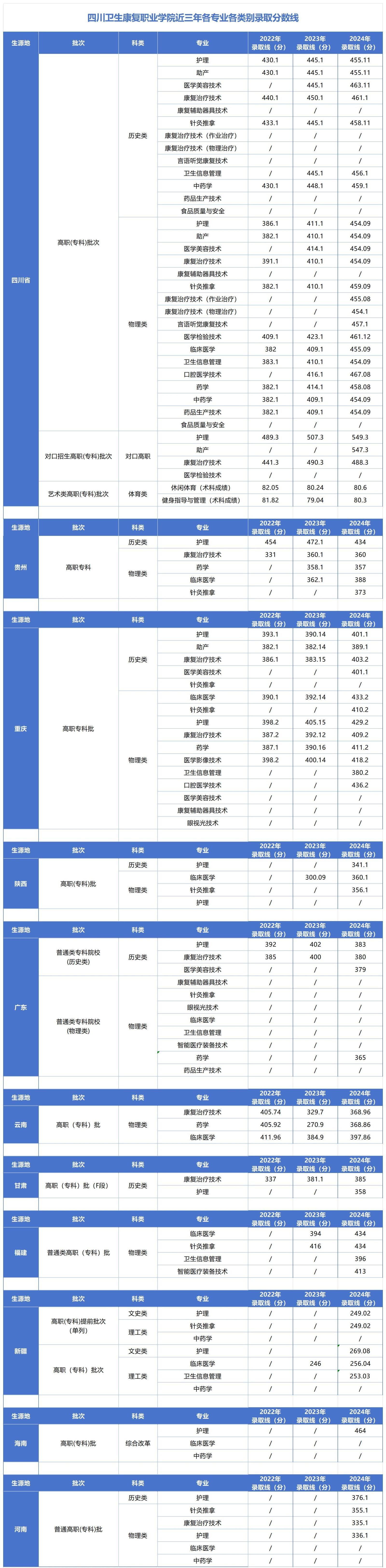 四川卫生康复职业学院近三年各专业各类别录取分数线