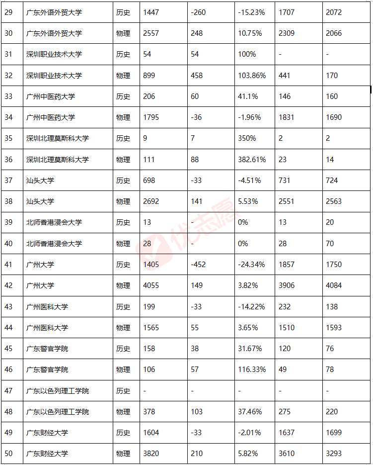 是历史类其计划数分化现象明显,45%的院校计划数出现缩减,平均降幅为8.7%。广东外语外贸大学和广州大学的降幅较为突出,分别达到-15.23%和-24.34%。