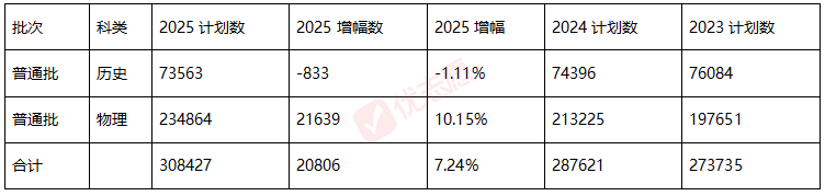 2025年招生计划总数308427人,同比增加20806人,增幅为7.24%。其中:
